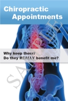 ![]() | Why keep appointments booklet The appointments booklet is a simple educational tool for giving to patients just starting out on their care, designed to answer questions about why they should keep recommended appointments. The booklet takes the format of a small greetings card with an additional tear of section for listing the patient’s first 12 appointments on one side and a referral request statement on the other. Inside the booklet answers questions from a patient’s viewpoint. Why so many treatments? The pain has gone so what are you treating? Why can’t I miss the odd appointment? Why should I let you know if it’s impossible to attend my appointment? On the rear, there is a simple to understand yet detailed explanation of how Chiropractic works so enthusiastic patients can fully understand why success is achieved via regular treatments.